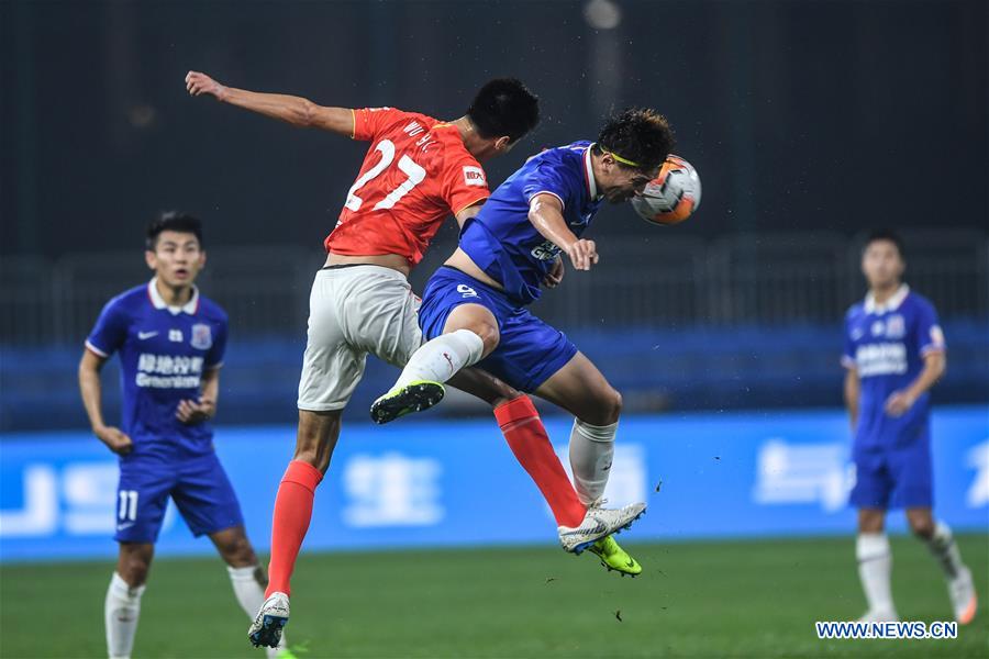 Wu Shaocong (top L) of Guangzhou Evergrande Taobao vies for a header with Yang Xu of Shanghai Greenland Shenhua during the 8th round match between Guangzhou Evergrande Taobao and Shanghai Greenland Shenhua at the postponed 2020 season Chinese Football Association Super League (CSL) Dalian Division in Dalian, northeast China's Liaoning Province, Aug. 30, 2020. (Xinhua/Pan Yulong)