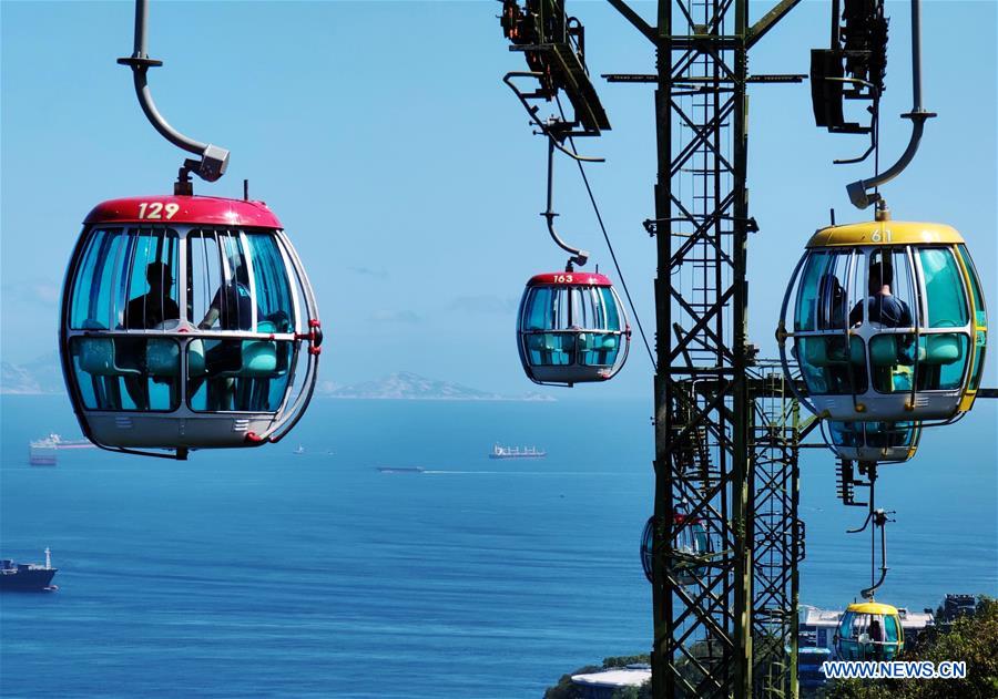 File photo taken with a mobile phone shows tourists taking cable cars at Ocean Park in Hong Kong, south China, June 15, 2020. Hong Kong's iconic theme park Ocean Park said on Tuesday that it will resume operation on Friday after being temporarily closed again for more than two months due to the COVID-19 outbreak. (Xinhua/Wang Shen)