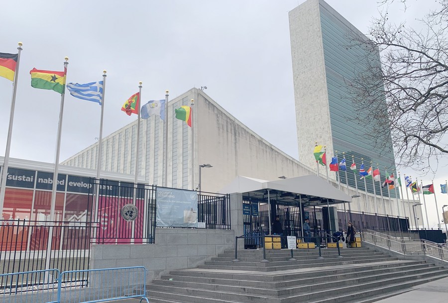 Photo taken on March 10, 2020 shows the visitors' entrance to the United Nations headquarters in New York. (Xinhua/Wang Jiangang)
