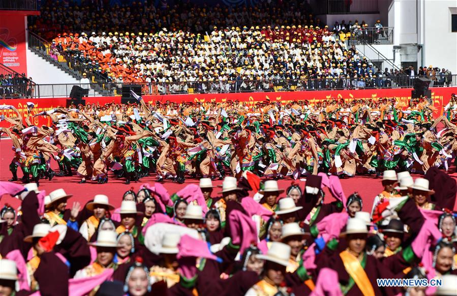 Dancers perform during a gala in celebration of the 70th anniversary of the liberation of Qamdo, in Qamdo City, southwest China's Tibet Autonomous Region, Oct. 9, 2020. (Xinhua/Jigme Dorje)