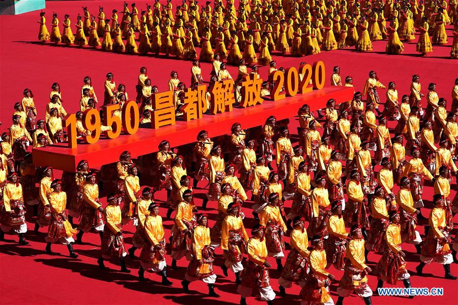 Photo taken on Oct. 9, 2020 shows a gala in celebration of the 70th anniversary of the liberation of Qamdo, in Qamdo City, southwest China's Tibet Autonomous Region. (Xinhua/Zhan Yan)