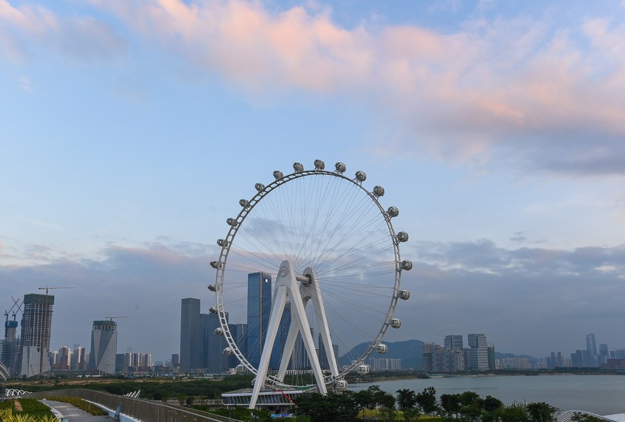 Photo taken on Oct. 6, 2020 shows a ferris wheel under construction at Baoan costal cultural park in Shenzhen, south China's Guangdong Province. The 128-meter-high ferris wheel is under construction. (Xinhua/Liu Dawei)