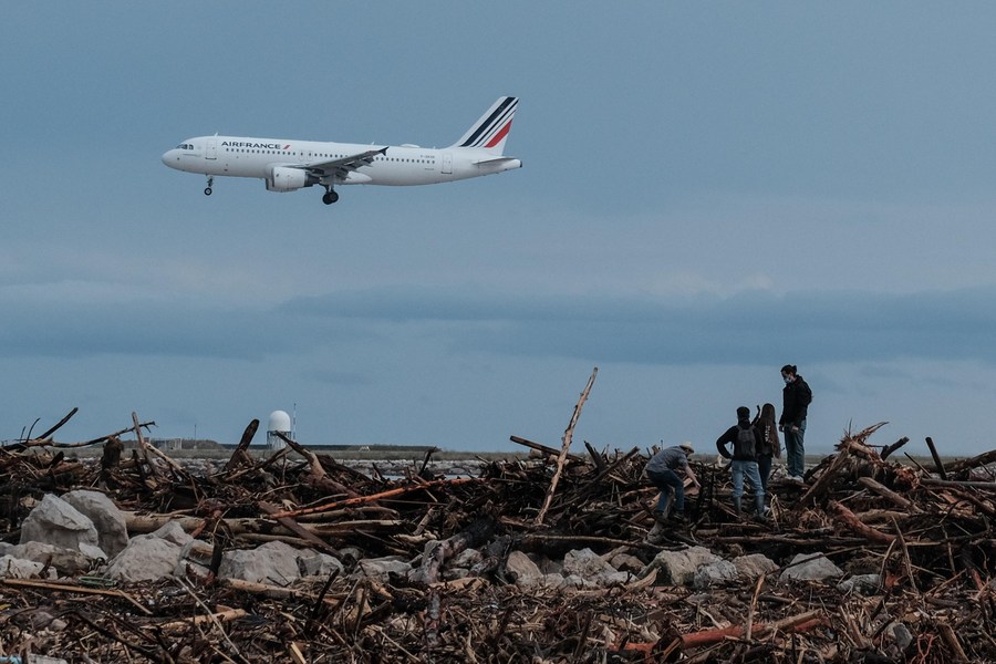 Photo taken on Oct. 4, 2020 shows a beach after a storm in Saint-Laurent-du-Var, near France's southern coastal city of Nice. Flash floods that struck France's southeast region of Alpes-Maritimes over the weekend have so far left two people dead and 20 others missing, local authorities said on Monday. (Photo by Serge Haouzi/Xinhua)