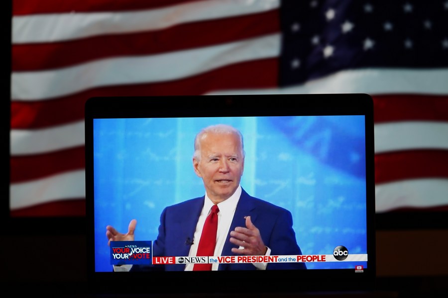 Photo taken in Arlington, Virginia, the United States, on Oct. 15, 2020 shows ABC live stream of Democratic presidential nominee Joe Biden's town hall event in Philadelphia, Pennsylvania. (Xinhua/Liu Jie)
