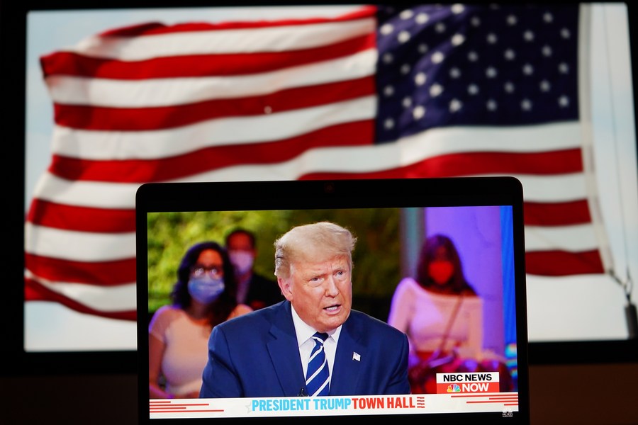 Photo taken in Arlington, Virginia, the United States, on Oct. 15, 2020 shows NBC live stream of U.S. President Donald Trump's town hall event outdoors in Miami, Florida. (Xinhua/Liu Jie)