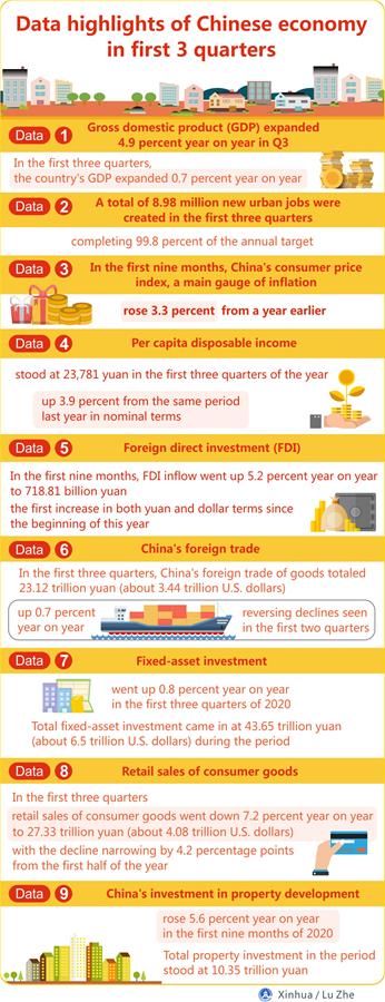 This graph shows data highlights of Chinese economy in the first three quarters. (Xinhua/Lu Zhe)
