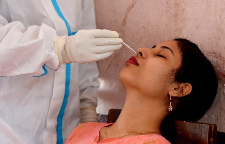 A health worker collects swab from a woman for a COVID-19 test at Paltan Bazar in Guwahati, India's Assam State, on Sept. 28, 2020. (Str/Xinhua)