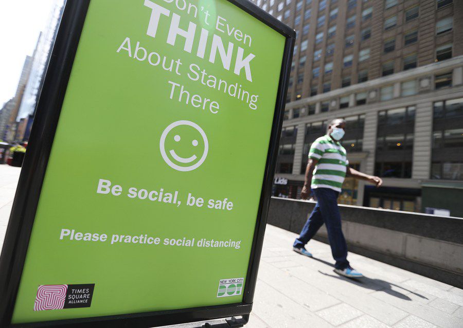A man walks past a social distancing notice on Times Square in New York, the United States, July 23, 2020. (Xinhua/Wang Ying)