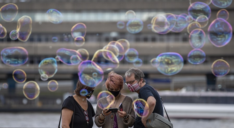People wearing face masks view photos by the River Thames in London, Britain, on Aug. 1, 2020. (Xinhua/Han Yan)
