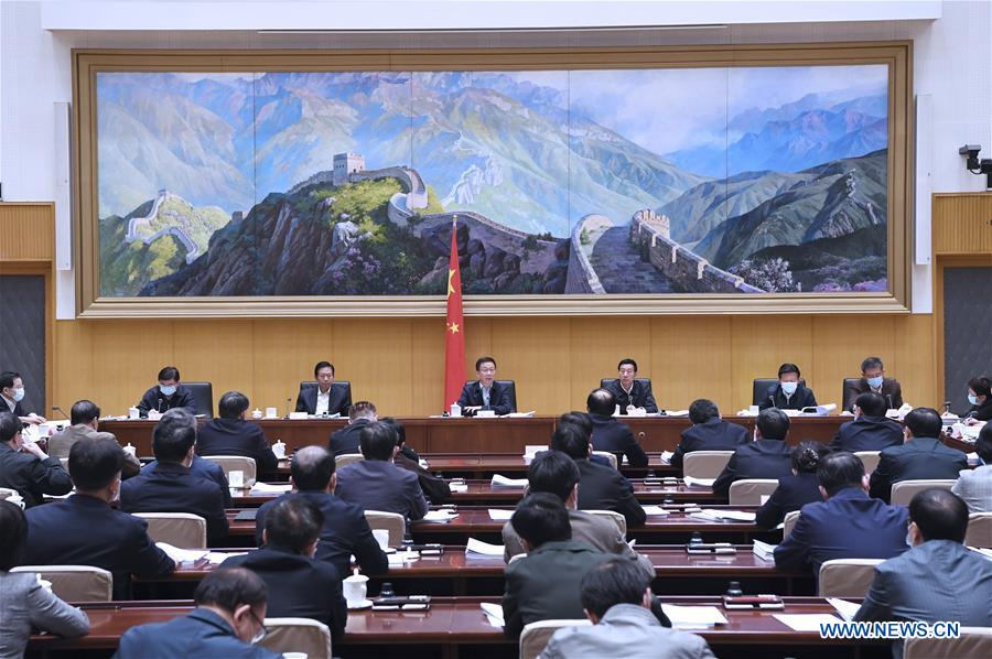 Chinese Vice Premier Han Zheng, also a member of the Standing Committee of the Political Bureau of the Communist Party of China Central Committee, attends a meeting on transforming government functions and deepening reforms to streamline administration, delegate power and improve regulation and services, in Beijing, capital of China, Oct. 21, 2020. (Xinhua/Rao Aimin)