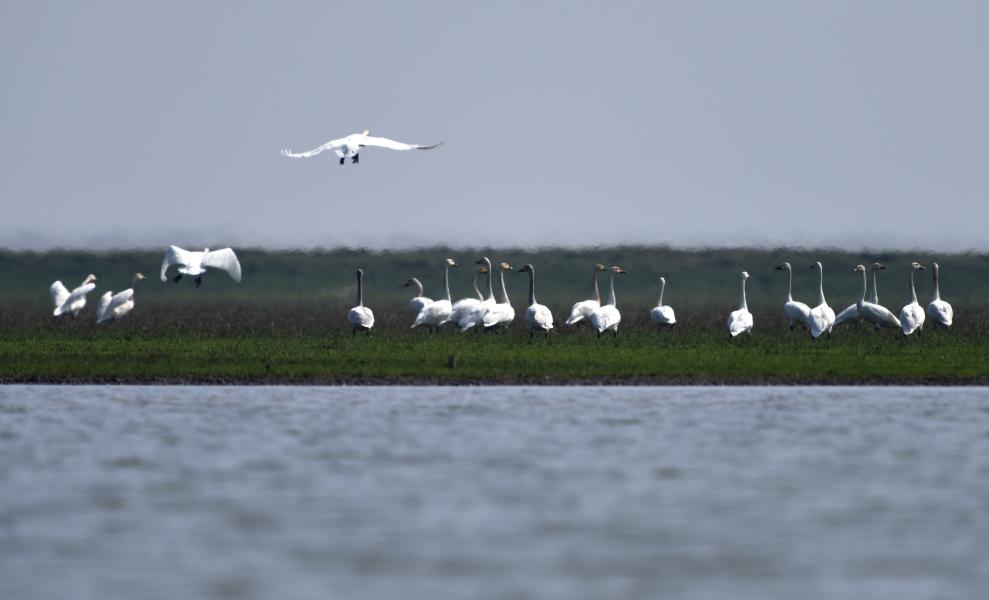 Swans are seen in an ecology remediation demonstration area in Dongting Lake area, central China's Hunan Province, Feb. 26, 2018. (Xinhua/Li Ga)