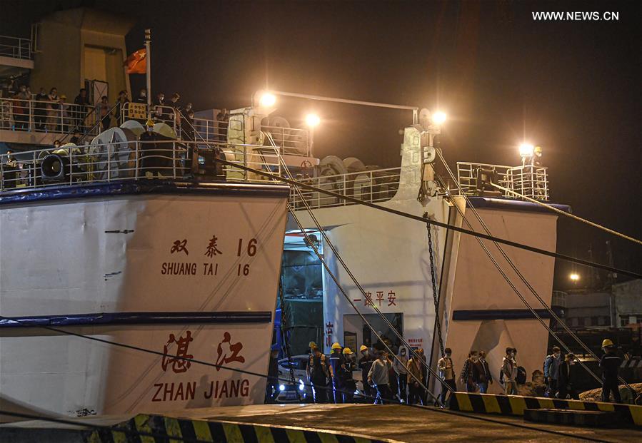 Passengers leave a roll-on roll-off ship after arriving at Xiuying Port in Haikou, south China's Hainan Province, Oct. 29, 2020. Ferry services across the Qiongzhou Strait have partially resumed from 4:00 p.m. Thursday as Typhoon Molave, the 18th this year, weakened. (Xinhua/Pu Xiaoxu)