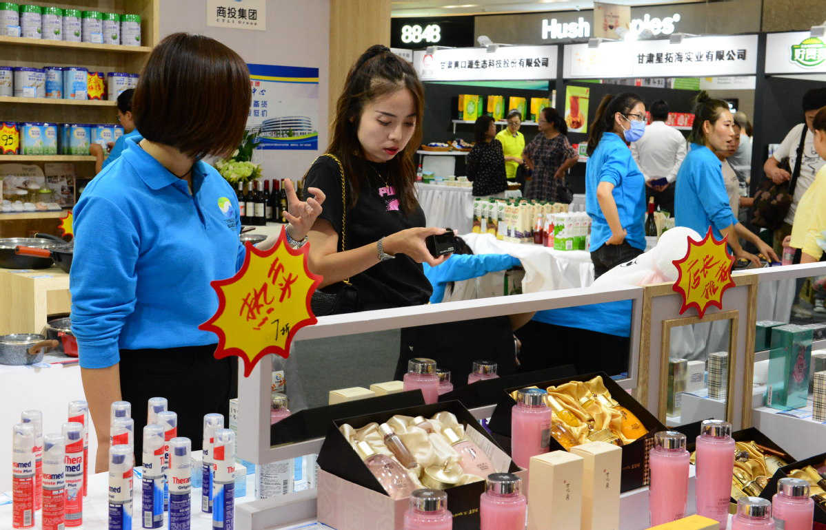 A shopper looks at cosmetics during a sales promotion in Lanzhou, Gansu province. [Photo by Pei Qiang/China Daily]