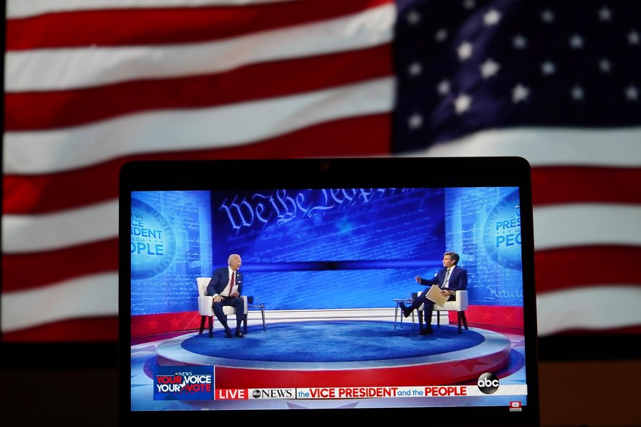 Photo taken in Arlington, Virginia, the United States, on Oct. 15, 2020 shows ABC live stream of Democratic presidential nominee Joe Biden's town hall event in Philadelphia, Pennsylvania. (Xinhua/Liu Jie)