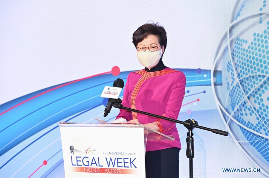 Chief Executive of the Hong Kong Special Administrative Region (HKSAR) Carrie Lam speaks at the opening of the Hong Kong Legal Week 2020 in Hong Kong, south China, Nov. 2, 2020. (Xinhua)