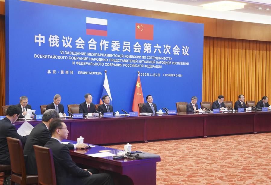 Wang Chen, vice chairman of the National People's Congress (NPC) Standing Committee, presides over the sixth meeting of the China-Russia committee for parliamentary cooperation via video link in Beijing, capital of China, Nov. 2, 2020. (Xinhua/Liu Weibing)