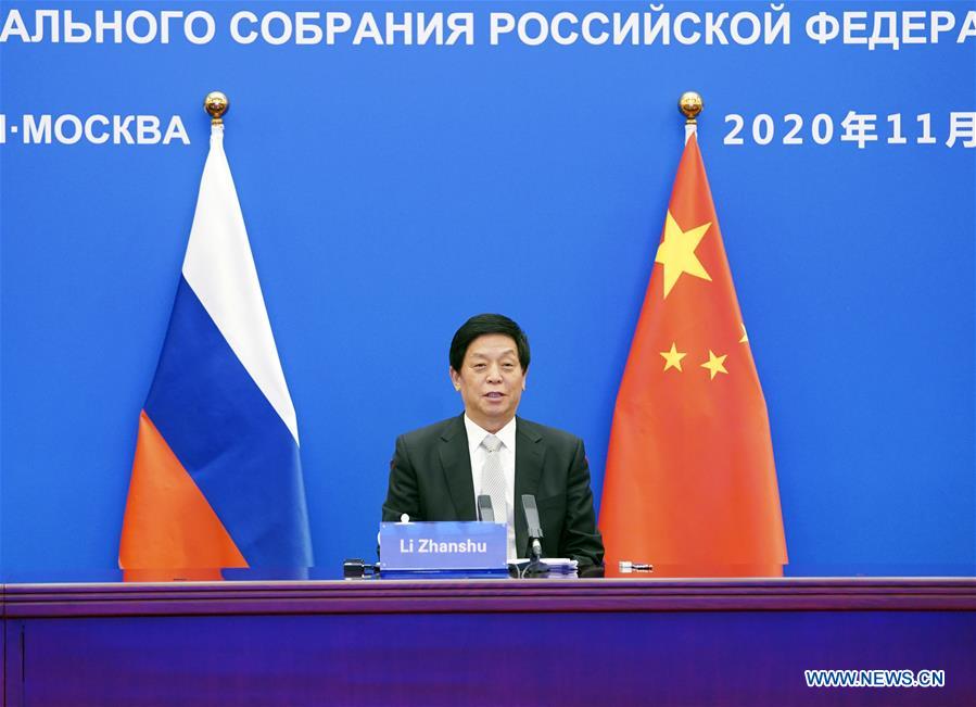 BEIJING, Nov. 2 (Xinhua) -- Li Zhanshu, chairman of the National People's Congress (NPC) Standing Committee, put forward four suggestions on Monday aimed at boosting cooperation between the legislatures of China and Russia.