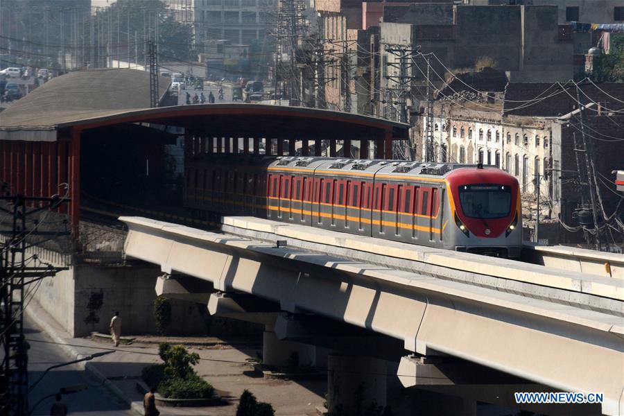 Photo taken on Nov. 8, 2020 shows an Orange Line metro train arriving at a station in Pakistan's eastern city of Lahore. After a five-year construction, Pakistan's first ever metro train service started its commercial operation last month in Lahore, the second largest city in Pakistan with a population of over 11 million. As an early-harvest project under the China-Pakistan Economic Corridor (CPEC), the Orange Line will further strengthen bilateral traditional friendship and usher in new opportunities for locals heading to a better life. (Photo by Sajjad/Xinhua)