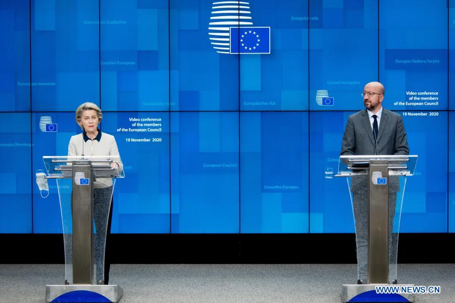 European Council President Charles Michel (R) and European Commission President Ursula von der Leyen attend a press conference following the EU leaders' videoconference in Brussels, Belgium, Nov. 19, 2020. The European Union leaders on Thursday held a regular video conference to coordinate actions against the pandemic. Apart from lifting restrictions, issues like forging a common approach to the use of rapid antigen tests and vaccinations were also discussed. (European Union/Handout via Xinhua)