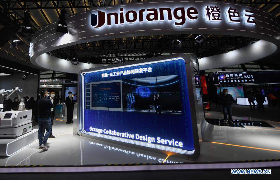 Visitors learn about Orange Collaborative Design Service at the booth of Uniorange during the Light of Internet Expo of the 2020 World Internet Conference (WIC) in Wuzhen, east China's Zhejiang Province, Nov. 22, 2020. Opening here on Sunday, the expo focuses on the world's most recent internet development trends and cutting-edge technologies, showcasing the latest internet technologies, achievements, products and applications of 130 enterprises and institutions from home and abroad. (Xinhua/Huang Zongzhi)