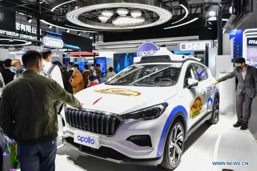 Visitors view a self-driving car during the Light of Internet Expo of the 2020 World Internet Conference (WIC) in Wuzhen, east China's Zhejiang Province, Nov. 22, 2020. Opening here on Sunday, the expo focuses on the world's most recent internet development trends and cutting-edge technologies, showcasing the latest internet technologies, achievements, products and applications of 130 enterprises and institutions from home and abroad. (Xinhua/Li Xin)