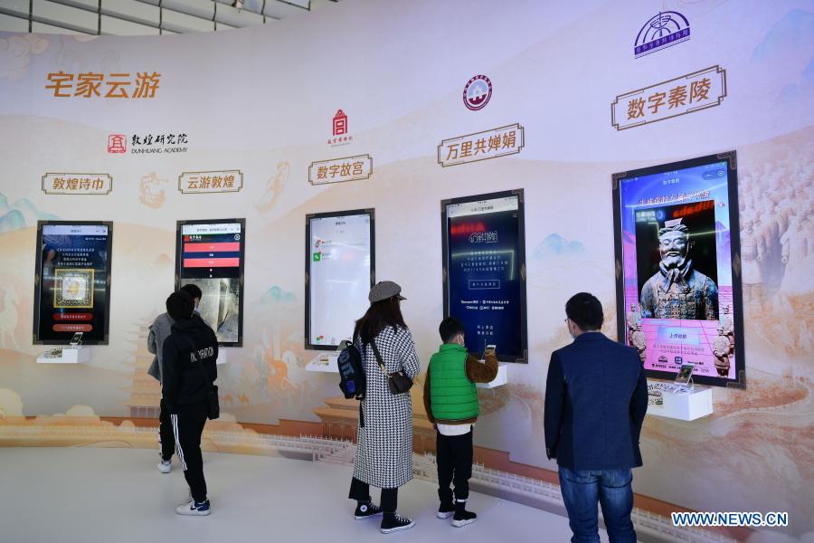 People try out cloud tourism devices at the booth of Tencent during the Light of Internet Expo of the 2020 World Internet Conference (WIC) in Wuzhen, east China's Zhejiang Province, Nov. 22, 2020. Opening here on Sunday, the expo focuses on the world's most recent internet development trends and cutting-edge technologies, showcasing the latest internet technologies, achievements, products and applications of 130 enterprises and institutions from home and abroad. (Xinhua/Li Xin)