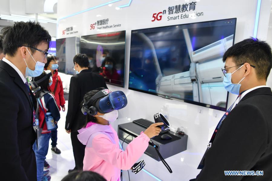 A kid tries a 5G smart education device at the booth of China Unicom during the Light of Internet Expo of the 2020 World Internet Conference (WIC) in Wuzhen, east China's Zhejiang Province, Nov. 22, 2020. Opening here on Sunday, the expo focuses on the world's most recent internet development trends and cutting-edge technologies, showcasing the latest internet technologies, achievements, products and applications of 130 enterprises and institutions from home and abroad. (Xinhua/Li Xin)