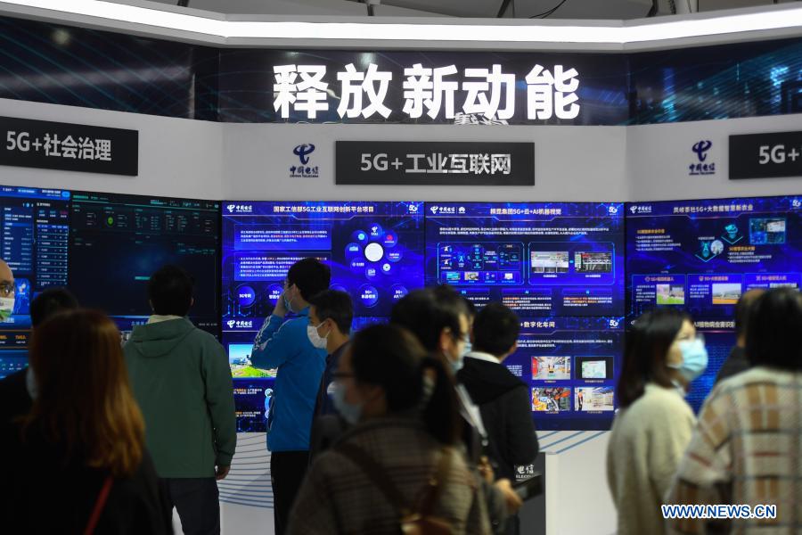 People learn about 5G technology at the booth of China Telecom during the Light of Internet Expo of the 2020 World Internet Conference (WIC) in Wuzhen, east China's Zhejiang Province, Nov. 22, 2020. Opening here on Sunday, the expo focuses on the world's most recent internet development trends and cutting-edge technologies, showcasing the latest internet technologies, achievements, products and applications of 130 enterprises and institutions from home and abroad. (Xinhua/Huang Zongzhi)