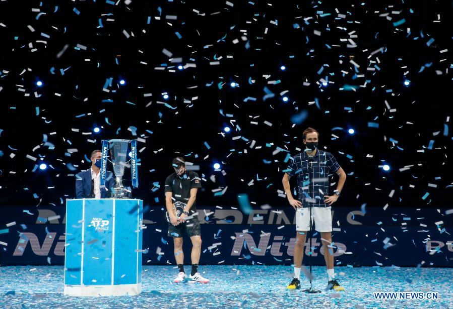 Daniil Medvedev (R) of Russia and Dominic Thiem (C) of Austria are seen during the awarding ceremony for the singles final at the ATP World Tour Finals 2020 in London, Britain, Nov. 22, 2020. (Xinhua/Han Yan)