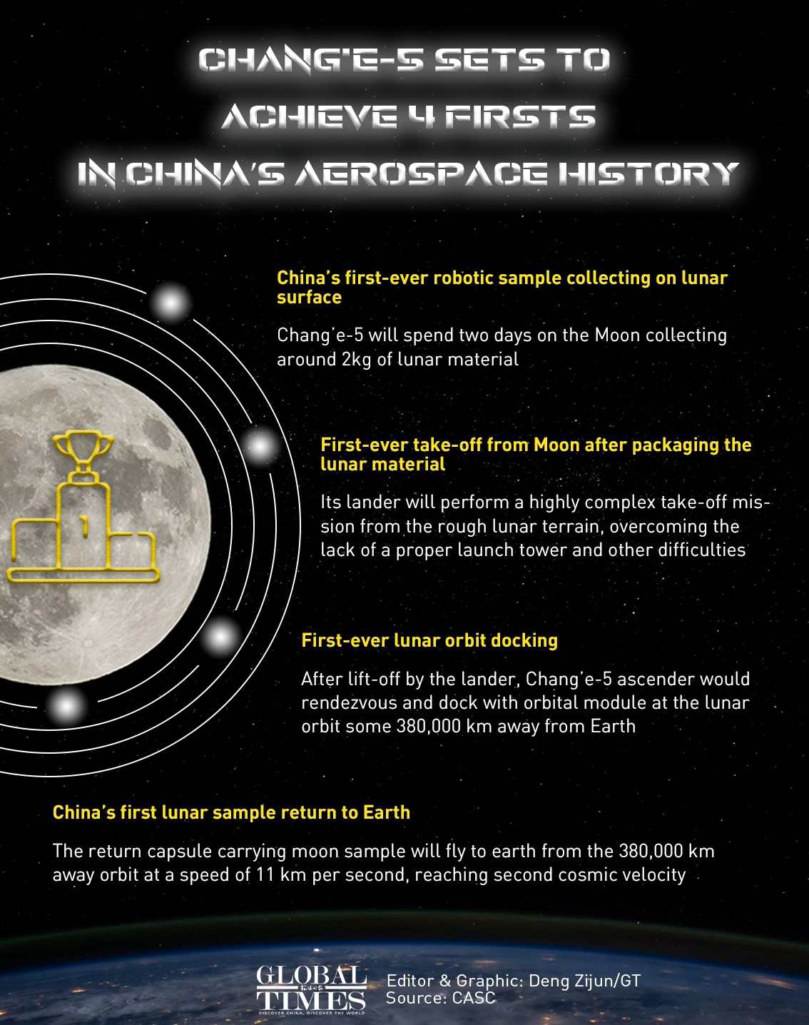 Sources close to the lunar probe mission told the Global Times that the Chang’e-5 probe is set to achieve four firsts in China's aerospace history.