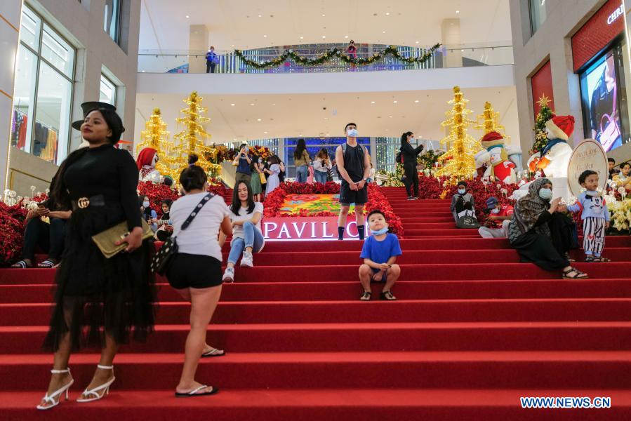 People take photos beside Christmas decorations at a shopping mall in Kuala Lumpur, Malaysia, Nov. 26, 2020. (Xinhua/Zhu Wei)
