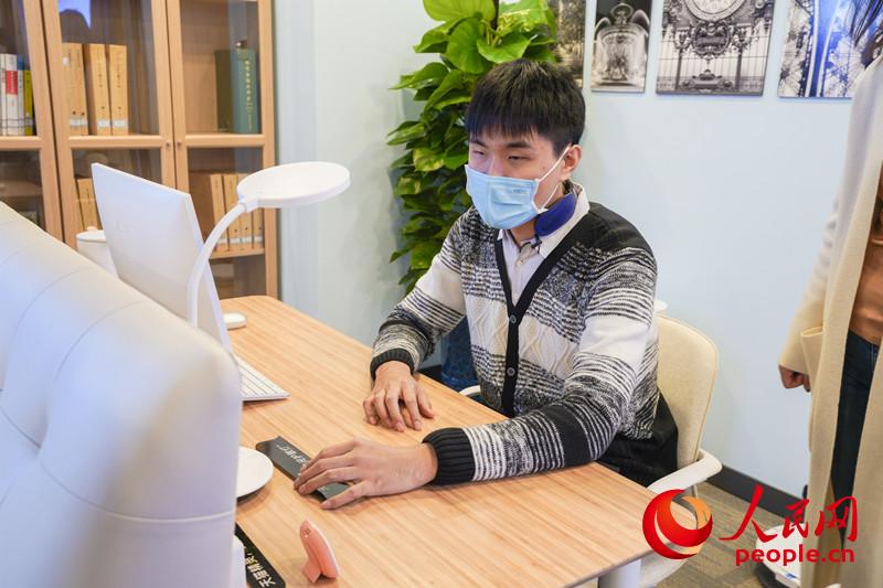 Gao Peiyou, a visually-impaired man, experiences smart devices in a study at China’s first smart home experience store for persons with disabilities, Dec. 3. (Photo by Weng Qiyu/People’s Daily Online)