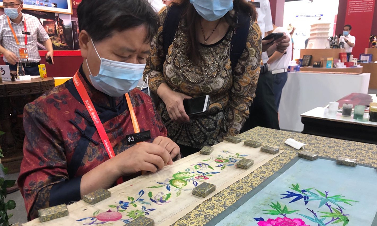 Huang Lijun, a retired cultural relics repairer at the China National Silk Museum, repairs a piece of colored silk cloth at the China International Fair for Trade in Services (CIFTIS) in Beijing on September 7, 2020.