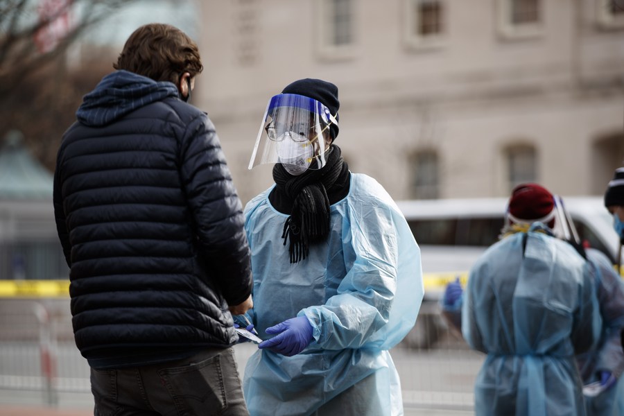 A healthcare worker helps people check in for COVID-19 test at a testing site in Washington, D.C., the United States, Dec. 9, 2020. (Photo by Ting Shen/Xinhua)