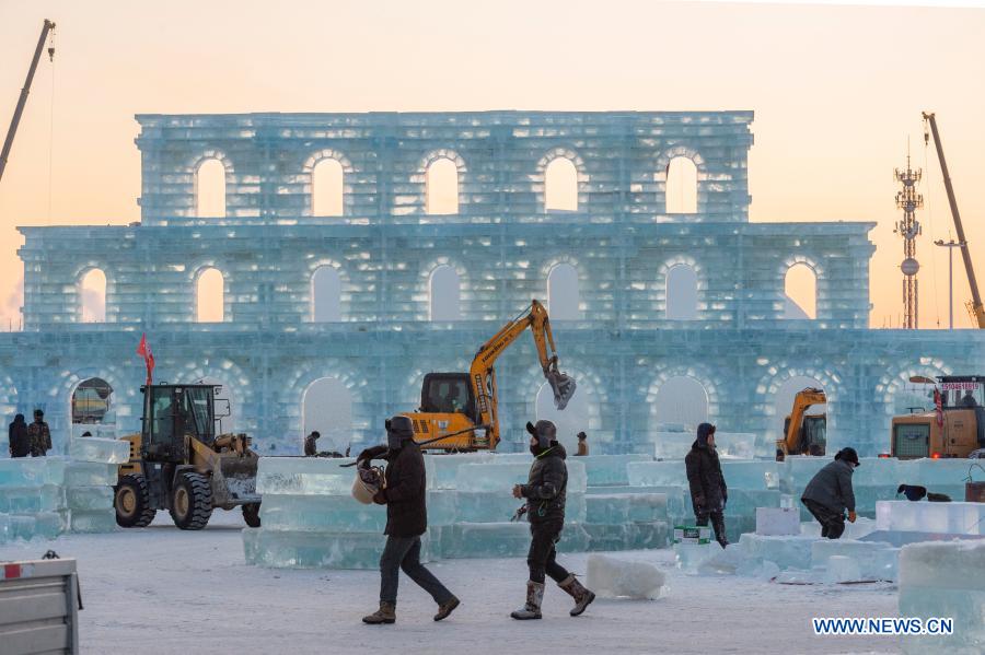 Workers work at a construction site for the Harbin Ice-Snow World, a renowned seasonal theme park opening every winter, in Harbin, northeast China's Heilongjiang Province, Dec. 14, 2020. The 22nd Harbin Ice-Snow World is expected to open in late December. (Xinhua/Xie Jianfei)