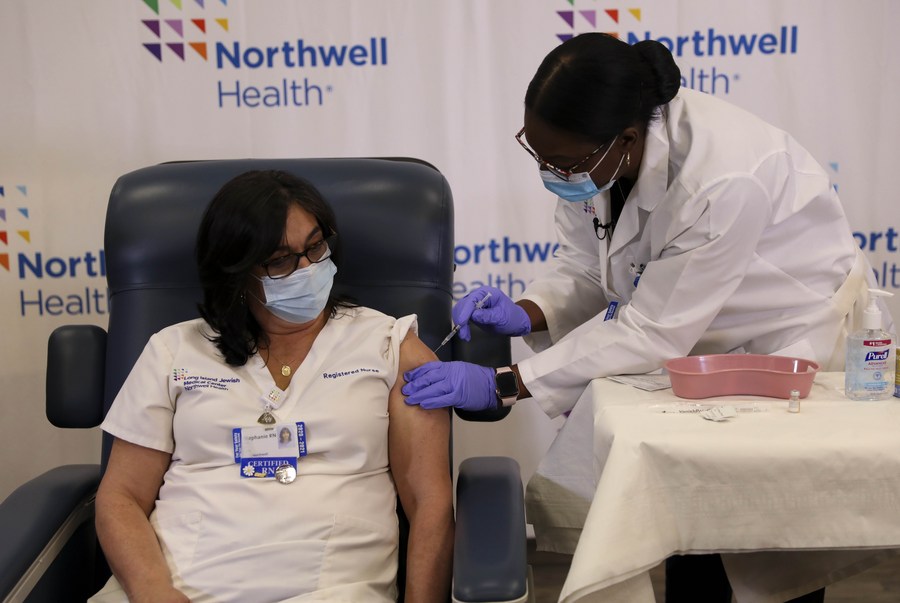 Stephanie Cal (L), a nurse at Long Island Jewish Medical Center, is inoculated with the COVID-19 vaccine in New York, the United States, on Dec. 14, 2020. (Xinhua/Wang Ying)
