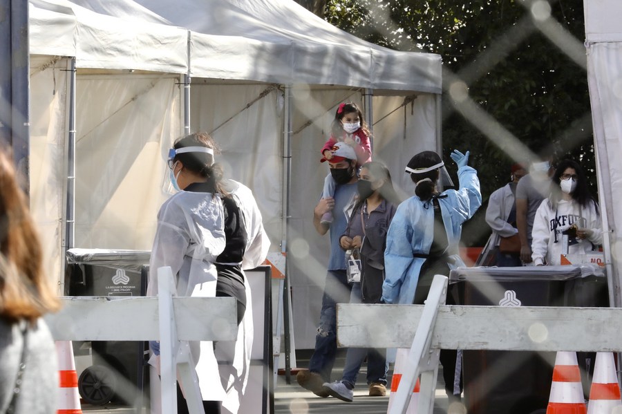 People are seen at a COVID-19 testing center at the San Fernando regional park in Los Angeles County, the United States, Dec. 8, 2020. (Xinhua)