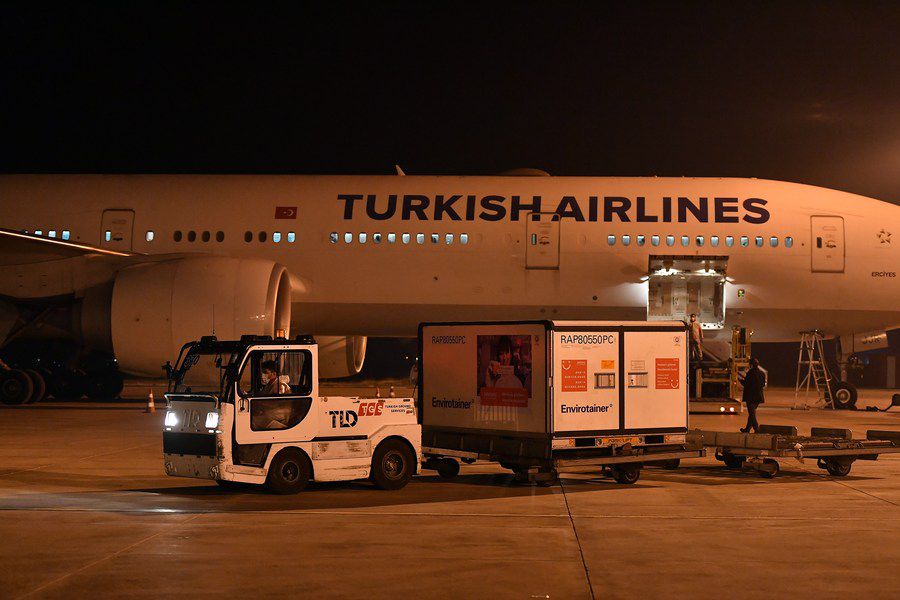 Workers unload a shipment containing boxes of China's SinoVac COVID-19 vaccine at Esenboga Airport in Ankara, Turkey, Dec. 30, 2020. (Photo by Mustafa Kaya/Xinhua)