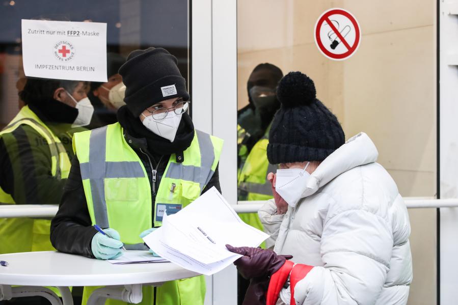 Staff members work at the entrance of a COVID-19 vaccination site in Berlin, capital of Germany, Dec. 27, 2020. (Xinhua/Shan Yuqi)