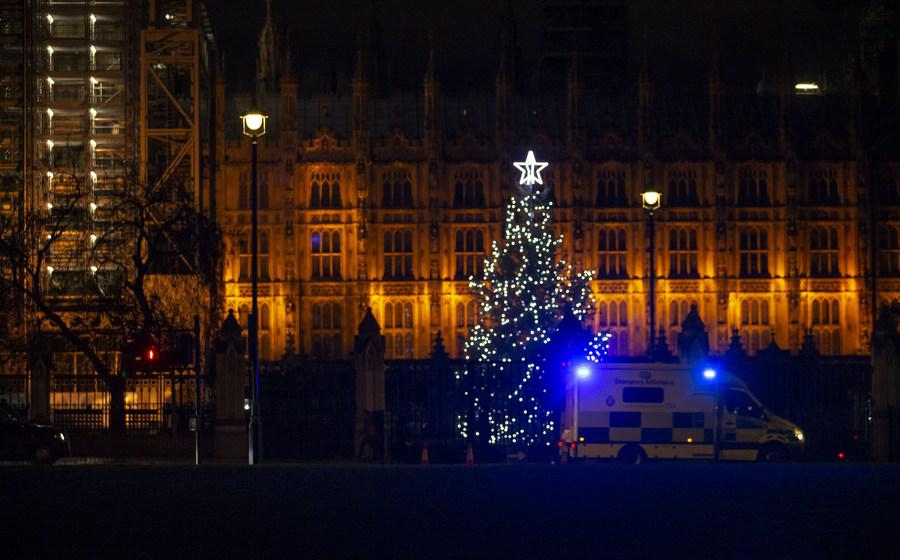 An ambulance passes by the Christmas tree outside the Houses of Parliament in London, Britain, on Dec. 23, 2020. (Xinhua/Han Yan)