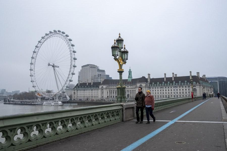 People walk along the Westminster Bridge in London, Britain, on Jan. 1, 2021. (Photo by Ray Tang/Xinhua)