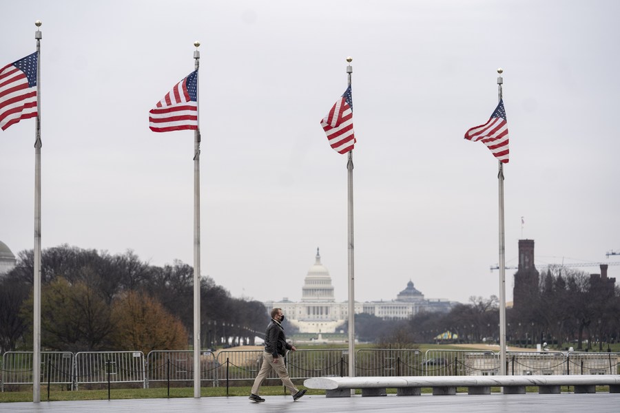 A man wearing a face mask walks on the National Mall in Washington, D.C., the United States, on Jan. 1, 2021. (Xinhua/Liu Jie)
