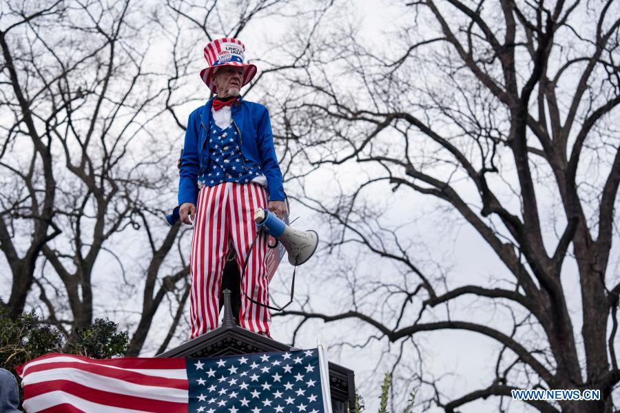 A supporter of U.S. President Donald Trump attends a demonstration near the U.S. Capitol building in Washington, D.C., the United States, on Jan. 6, 2020. U.S. President-elect Joe Biden condemned what he called "insurrection" at the U.S. Capitol on Wednesday, after some supporters of the Republican incumbent, Donald Trump, broke into the building, forcing electoral vote counting to halt. (Xinhua/Liu Jie)
