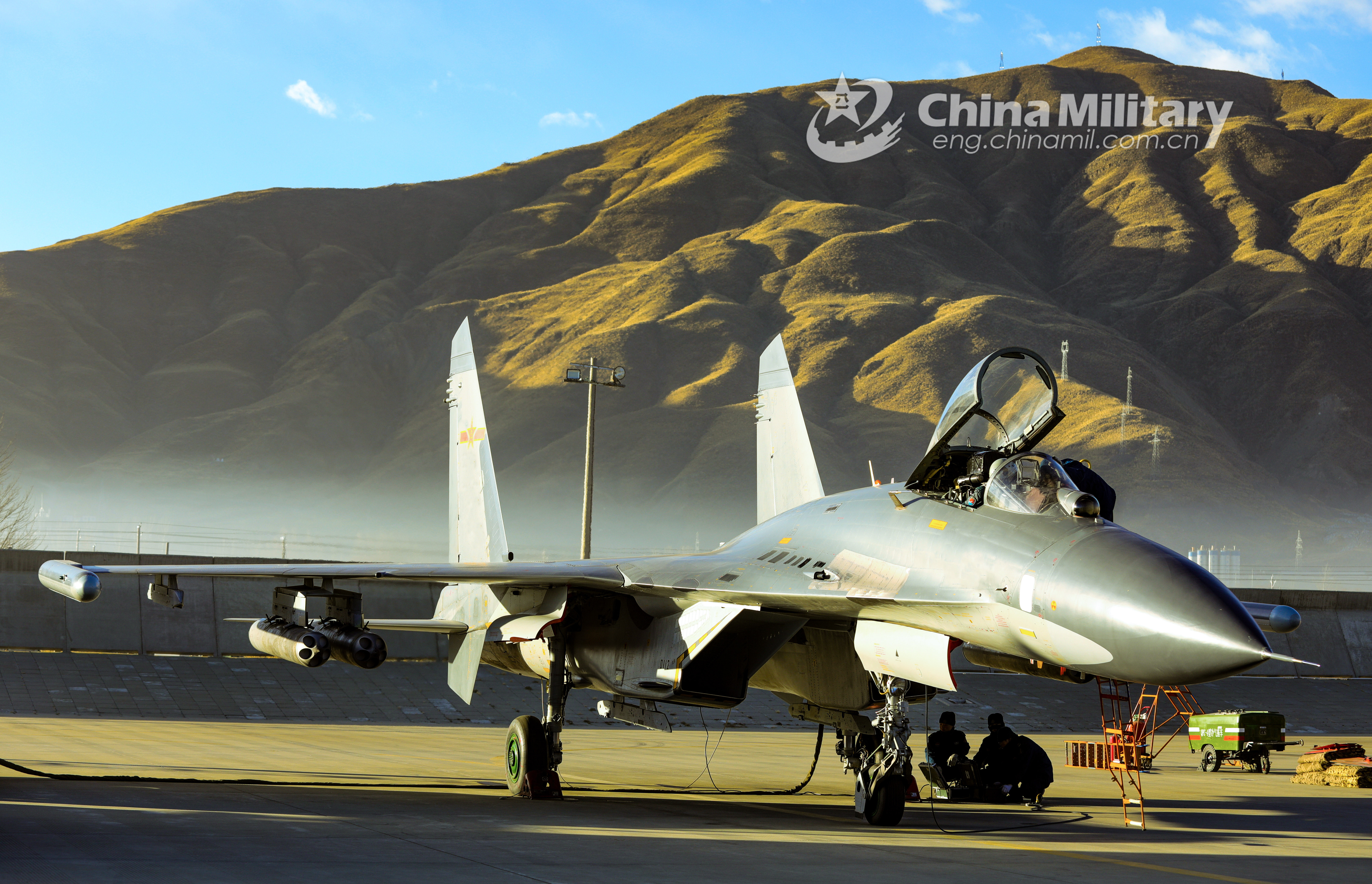 Ground crews assigned to an aviation brigade of the air force under the PLA Western Theater Command perform thorough inspections on a fighter jet prior to a real-combat flight training exercise. (eng.chinamil.com.cn/Photo by Zhang Weiwei)