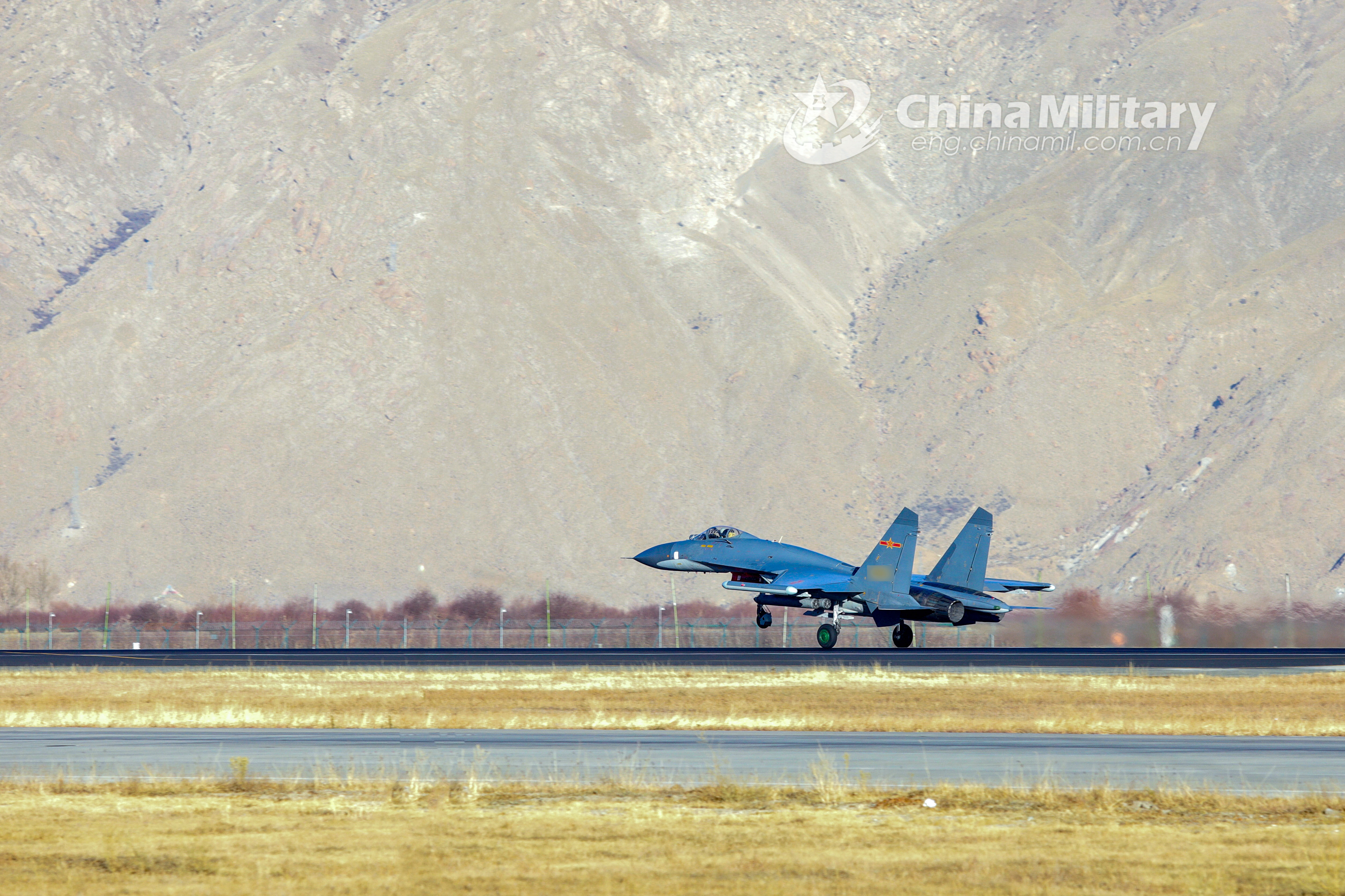 A fighter jet attached to an aviation brigade of the air force under the PLA Western Theater Command takes off from the runway for a real-combat flight training exercise. (eng.chinamil.com.cn/Photo by Zhang Weiwei)