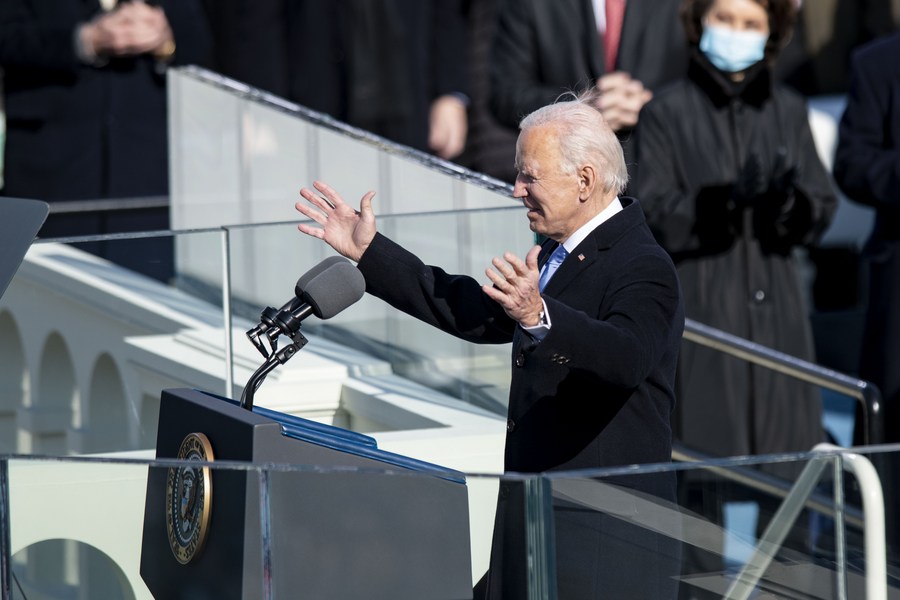 U.S. President Joe Biden delivers his inaugural address after he was sworn in as the 46th President of the United States in Washington, D.C., the United States, on Jan. 20, 2021. (Xinhua/Liu Jie)