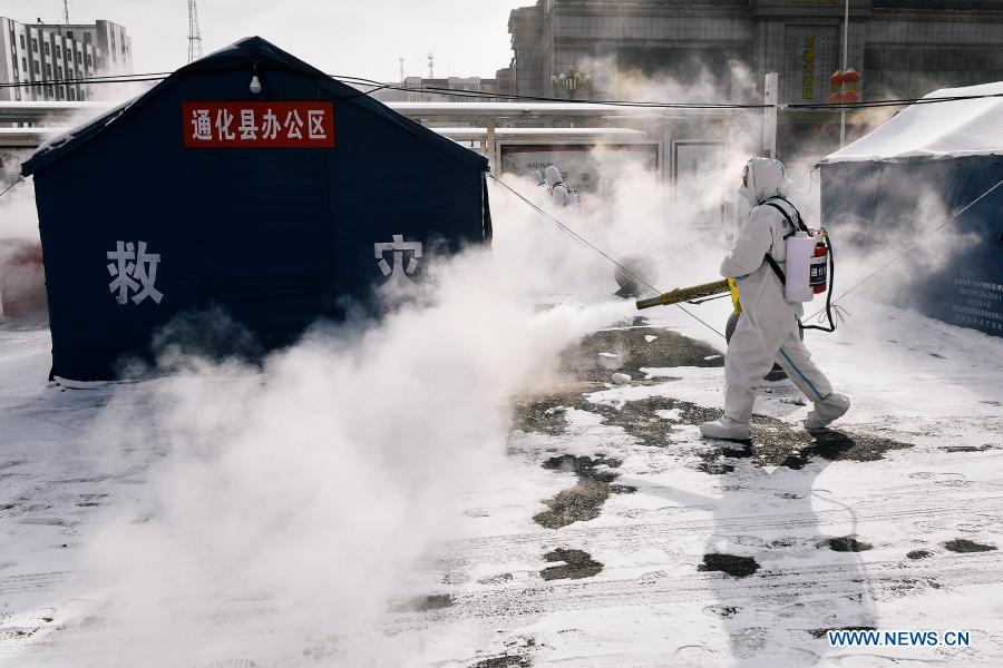 Staff members conduct disinfection in Tonghua City, northeast China's Jilin Province, Feb. 19, 2021. Disinfection in the public area were conducted as a COVID-19 prevention and control measure in preparation for work resumption in Tonghua. (Xinhua/Xu Chang)