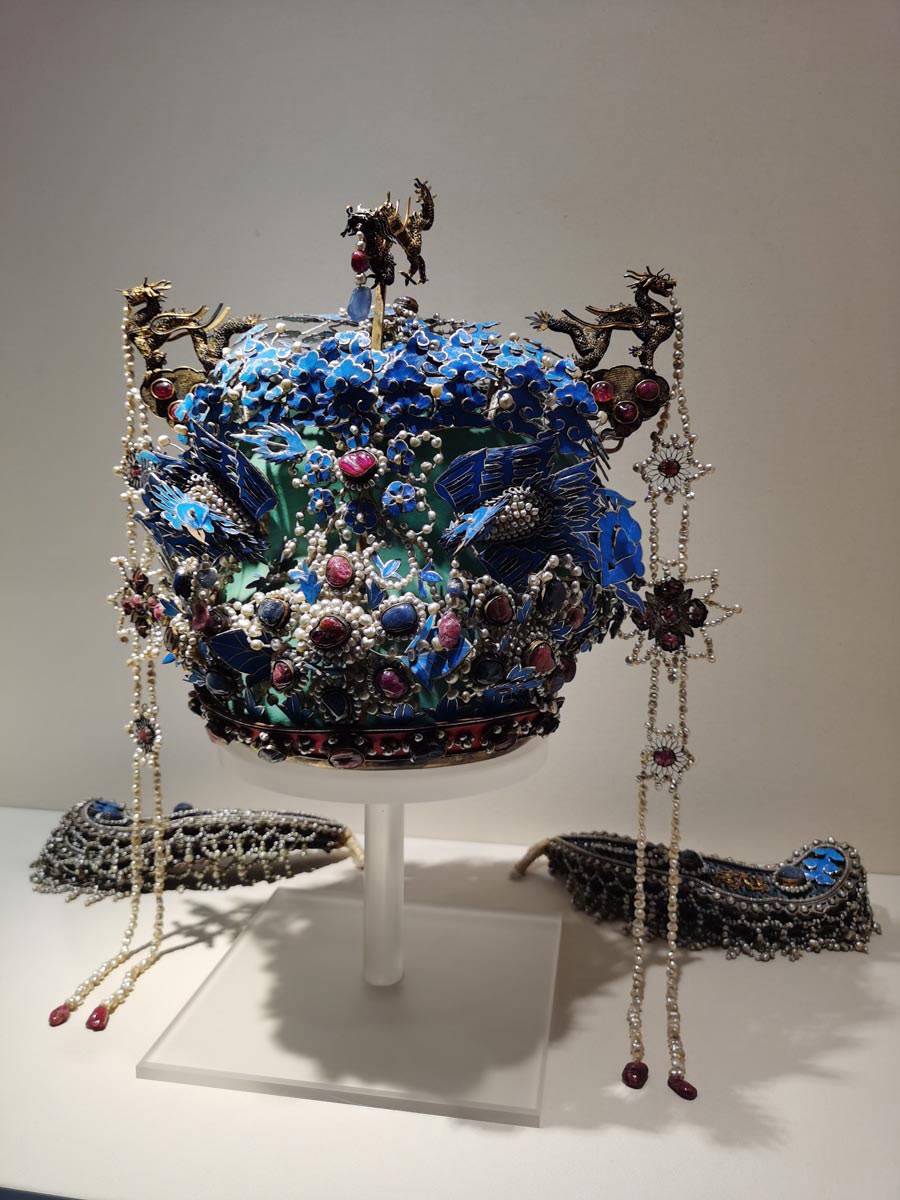 The coronet was a replica of the one owned by Ming empress Xiaojing (1565-1611), called sanlongliangfengguan, meaning a coronet of three dragons and two phoenixes.