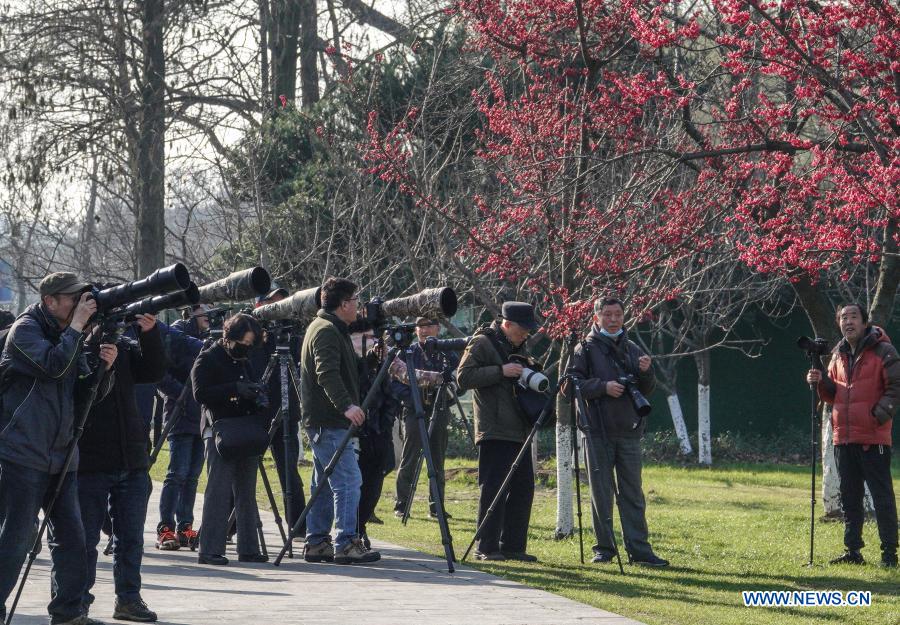 People take photos at a garden near Xuanwu Lake in Nanjing, capital of east China's Jiangsu Province, Feb. 19, 2021. (Xinhua/Yang Lei)