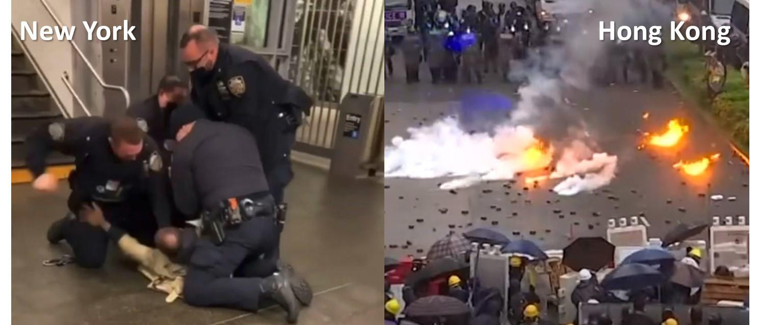 Side-by-side photos show the NYPD officers arresting a suspect in New York on Feb. 16, 2021 (L) and protesters hurling petrol bombs at police in Hong Kong on Aug. 25, 2019.